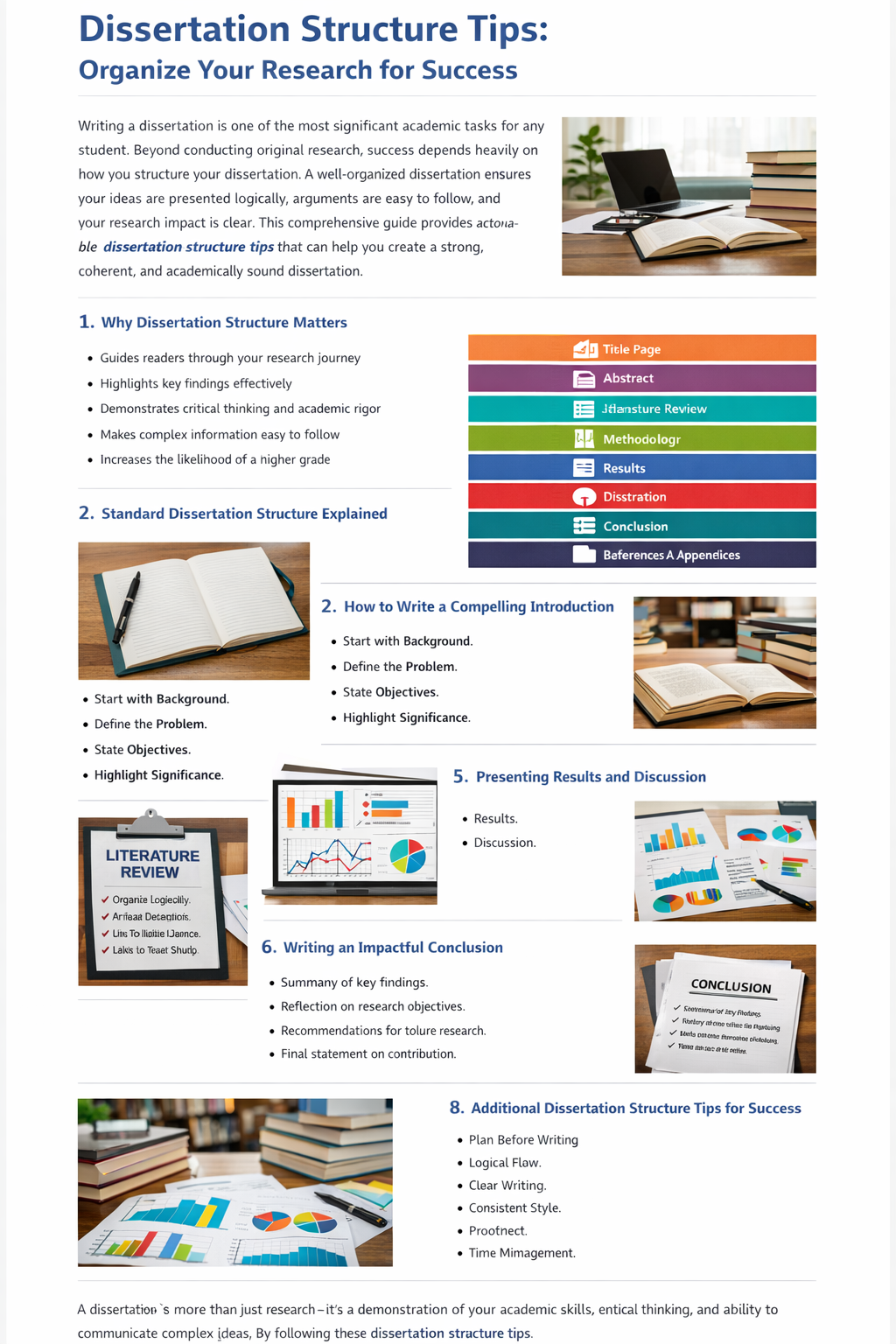 A well-structured dissertation is key to academic success. By following these dissertation structure tips, you can organize your research effectively, present arguments clearly, and achieve a high-quality final document. Start planning early, write systematically, and review your structure regularly to ensure your dissertation stands out.